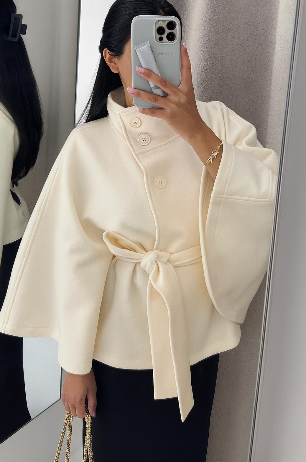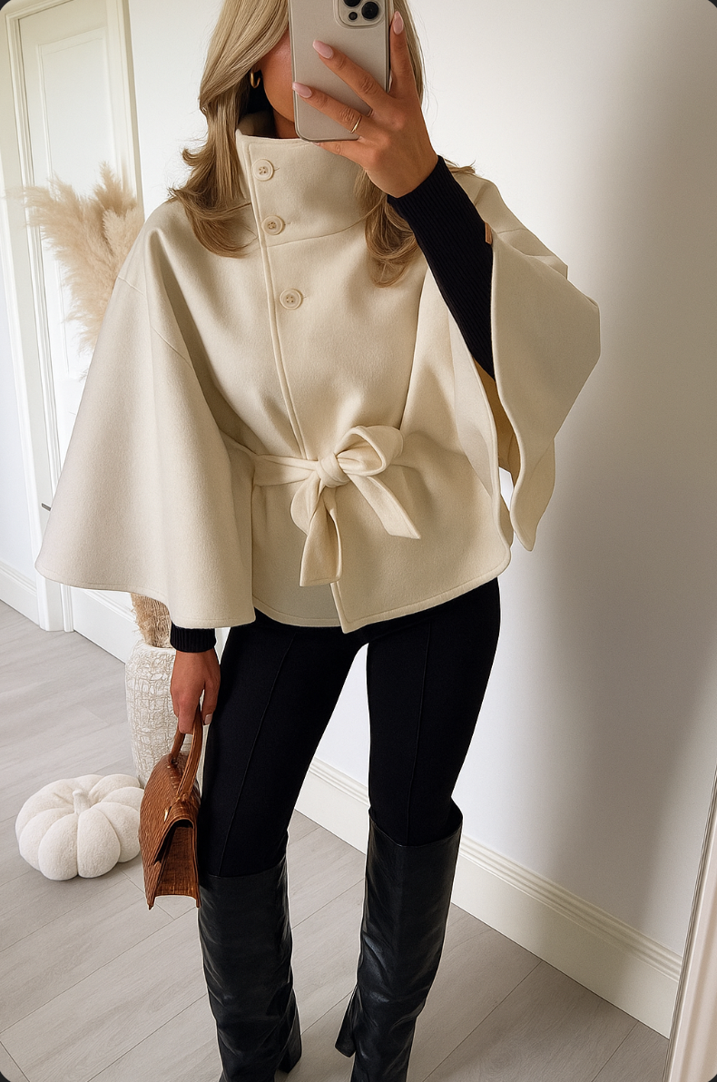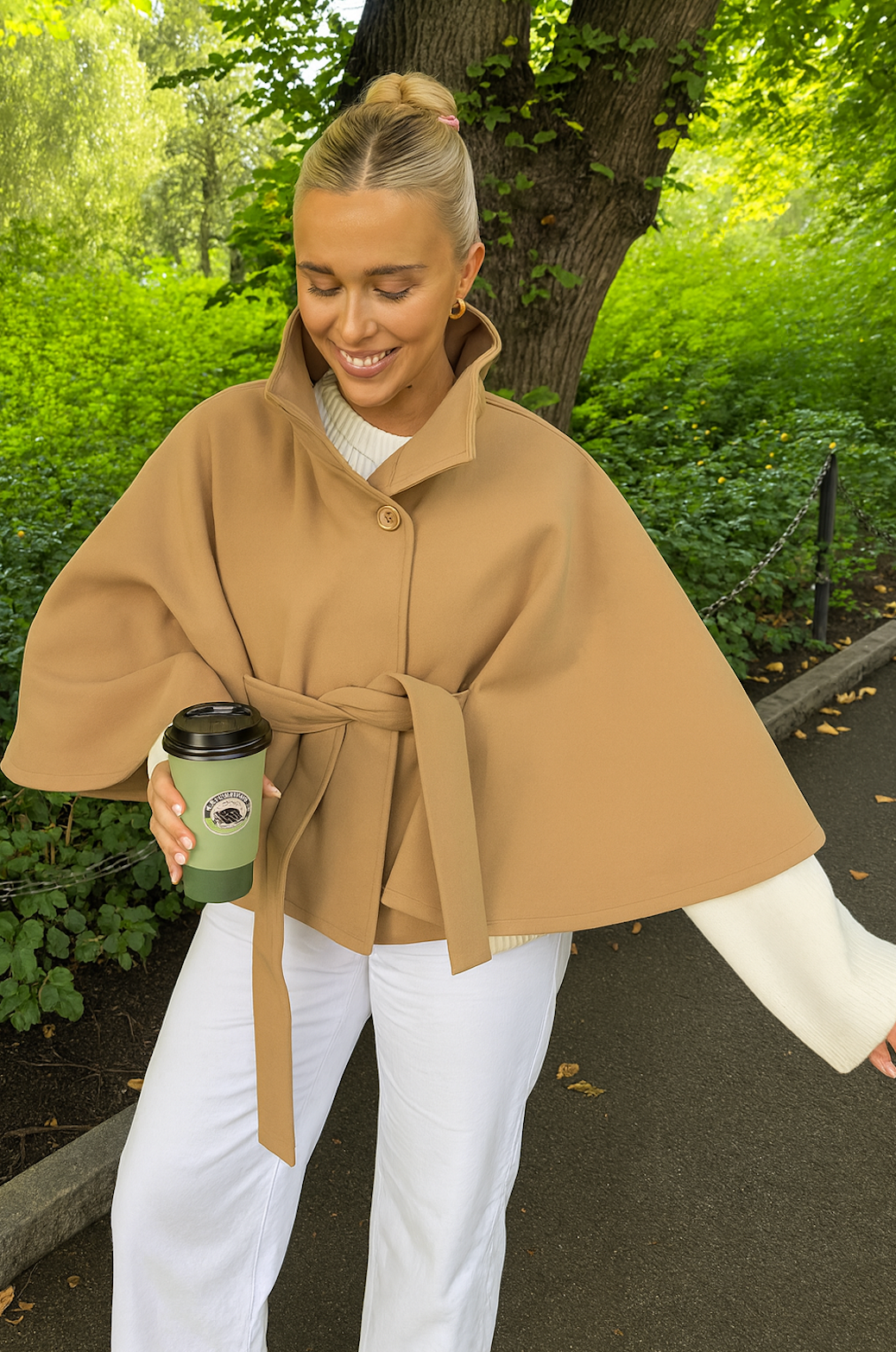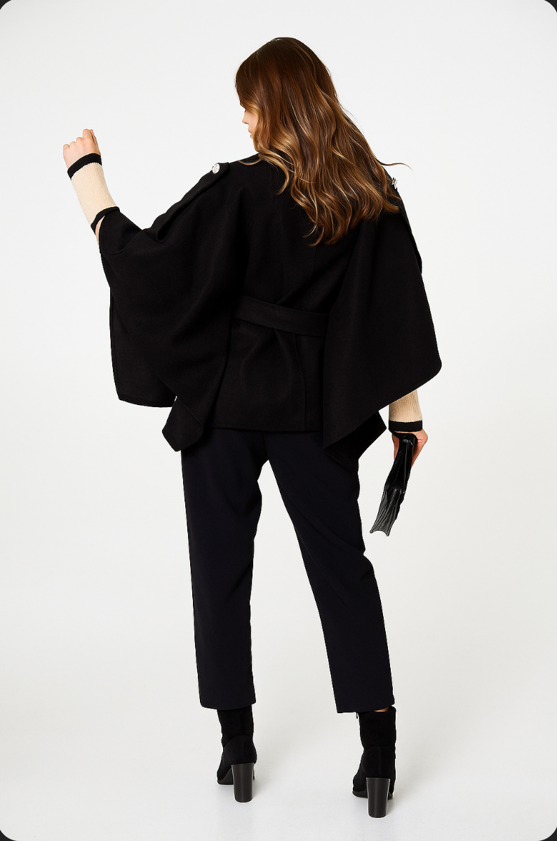 This cape coat is the perfect mix of elegance and warmth. Made with soft, premium fabric, it drapes beautifully while keeping you cozy all day. Featuring a flattering belted waist and structured shoulders, it adds a touch of sophistication to any outfit. Ideal for layering on chilly days, it’s the go-to piece for stepping out in effortless style.